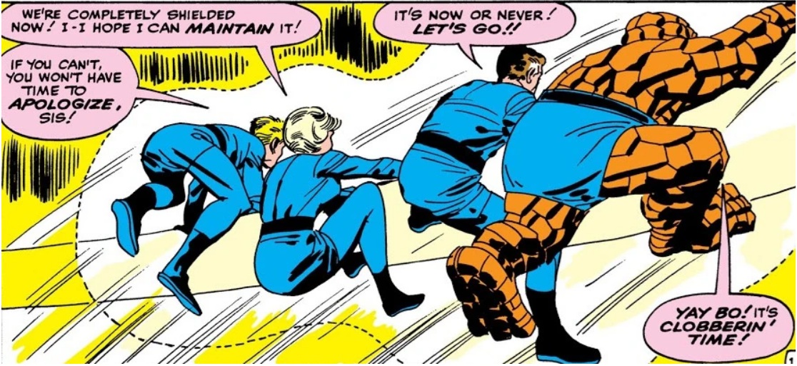 Sue Storm/Invisible Woman uses her new found ability to create force fields to enable them to pass through their radioactive prison. As the Fantastic Four escape and prepare to go after the Mole Man, Ben Grimm/The Thing utters the catchphrase and the quote for the very first time in Marvel continuity.
